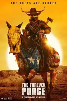 In April 2020, the film's title was revealed as The Forever Purge.[32][33][34] The film was originally scheduled for a theatrical release in the United States on July 10, 2020, by Universal Pictures.[8][9] On May 15, 2020, its release was postponed indefinitely due to the COVID-19 pandemic.[35][36][37] On July 8, 2020, it was reported that the film had been rescheduled for July 9, 2021.[38][39] On April 9, 2021, it was reported that the film's American release date had been pushed up a week to July 2.[40]