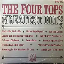 The Four Tops Greatest Hits is a greatest hits album by the Four Tops, released in August 1967. It peaked at No. 4 on the Billboard albums chart in the United States, remaining on the chart for 73 weeks, and is the first Motown album to reach No. 1 in Britain. It spent one week at the top of the UK Albums Chart in 1968.[2] the original British release had 16 tracks on it; this is the US album. The additional tracks were "I'll Turn to Stone", "Where Did You Go?", "Darling, I Hum Our Song", and "You Keep Running Away".