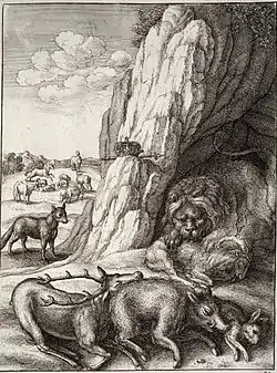 During the 17th century the fable was almost always interpreted as a warning against association with rulers. Wenceslas Hollar emphasised the political connection in his illustration of The Fables of Aesop (1673). At the mouth of a cave, a crown and sceptre are laid prominently on rocks as the lion feasts on its slaughtered visitors.[10] The same point is made by Pieter de la Court in his Sinryke Fabulen (Amsterdam, 1685). Above the woodcut illustrating the fable is the Dutch distich Een oud hoveling, een oud schoveling (an old courtier, an old survivor), while below it is the Latin proverb Cum principibus ut cum igne (With princes as with fire, be wary).[11]