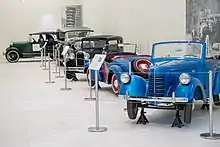 Automobiles on display include an 1881 Brougham, 1898 Panhard et Levassor Tonneau, 1903 Baker Electric, 1906 Outing Wagon, 1909 Bailey Electric Phaeton, 1909 Keystone Sixty-Six Roadster, 1911 Penn 30 Touring Car, 1912 Daimler Landaulet, 1914 Ford Model T Touring Car, 1914 Rolls-Royce Silver Ghost Touring Car, 1917 Standard Model E Touring Car, 1924 Auto Red Bug Flyer, 1931 Lincoln Model K Sport Phaeton, and 1940 American Bantam Convertible Coupe.