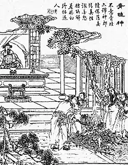 ![]() Xue Kunsheng burning the Frog God Temple, in a 19th-century illustration from Xiangzhu liaozhai zhiyi tuyong (Liaozhai with commentary and illustrations; 1886) | |||