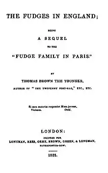 The Fudges in England is an 1835 sequel to Thomas Moore's 1818 work The Fudge Family in Paris, which had depicted the visit of the fictional British Fudge Family to Paris, where the daughter Biddy had fallen in love with a young man whom she had taken to be the King of Prussia but was in fact a draper. The original work was extremely popular and Moore had received requests to write a follow-up. He began working on The Fudge Family In Italy, but abandoned it and it wasn't until seventeen years after the original that the sequel was released.