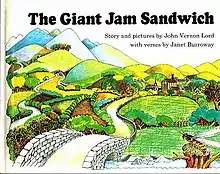 The Giant Jam Sandwich is a children's picture book, with story and pictures by John Vernon Lord and verses by Janet Burroway.[1][2] The rhyming story tells how the fictional town of Itching Down was invaded by four million wasps. At first, the villagers are unsure what to do, until Bap, the town baker, points out that wasps like strawberry jam, so they decide to build a gigantic jam sandwich to trap the pesky insects. It works, even though only 3,999,997 of them get trapped while the last three fly off in fear, never to return. The villagers celebrate, and the sandwich is carried off by the birds.[3]