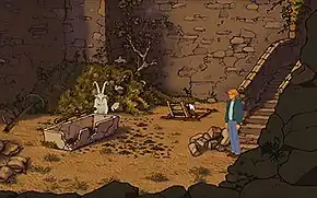 George must allow the goat to butt him when trying to reach the entrance, but while the goat is returning to its original position, the player must click on the farming machinery, which causes George to quickly jump up and run to the machinery and slightly reposition it. When returned to its original position, the goat again charges and butts George, but while doing so, gets its rope entangled with the machinery, due to its repositioning. This allows George to move freely and enter the dig.[1]