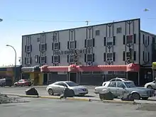 The Gold Range, on 50th Street, is a notorious location with a reputation stretching across the Canadian Arctic. It was built on the site of The Cave Restaurant and Central Apartments (formerly The Veterans Restaurant and Rooming House), which was destroyed by fire in 1956. The Gold Range is commonly known as "The Strange Range", having housed a rough and tumble bar, strip joint, boarding house and cafe complex since it was completed during 1957. Grand opening of the 52-room hotel, cafe and cocktail bar was in May 1958.[2]