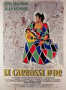 The Golden Coach (French: Le Carrosse d'or; Italian: La carrozza d'oro) is a 1952 film directed by Jean Renoir that tells the story of a commedia dell'arte troupe in 18th-century Peru. The screenplay was written by Renoir, Jack Kirkland, Renzo Avanzo and Giulio Macchi, and is based on the 1829 play Le Carrosse du Saint-Sacrement (The Coach of the Blessed Sacrament), by Prosper Mérimée. It stars Anna Magnani, Odoardo Spadaro and Duncan Lamont.