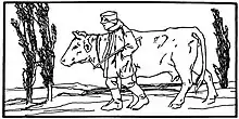 He arrived home in a bad mood and decided he would buy another cow. This he did and he slaughtered it himself, thinking that if he could get a good price for the meat he would make as much as the two cows had been worth and would have the cow's hide too. The peasant took the meat to town where he was met at the town gate by a pack of dogs led by a large greyhound, who belonged to the town's butcher. The greyhound came sniffing to the meat and barked "Bow wow, what now?" The peasant said to the dog, "I understand that you want the meat but I cannot give it to you for free. If you will be responsible for your fellows I will leave the meat with you for I know your master. But mind, you must bring me the money for the meat in three days." "Bow wow, what now?" said the dog. Satisfied with the deal the peasant left.[1][2]