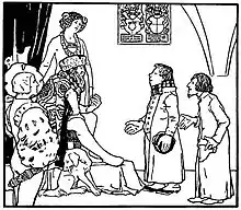 On being told of the peasant's disrespect the king angrily demanded that he be brought before him. The Jew went straight to the peasant to tell him he must go at once to the king just as he was. The peasant said, "It is not right that someone like me with so much gold in his pockets should appear before the king shabbily dressed. Lend me a nice coat so I can make a fitting appearance." Fearing that the king's anger would cool if there was a delay which would lead to the loss of his reward and the peasant's punishment the Jew lent him a fine coat.[1][2]