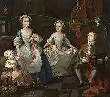 The Graham Children is a conversation piece,[3] an informal group portrait of family or friends, often engaged in conversation or some other kind of activity,[4] though the painting is larger than a typical work of that type. From left to right in the picture are Thomas, born 1740 and dressed in skirts as was typical for small boys until they were breeched, Henrietta, Anna Maria and Richard.[note 1]