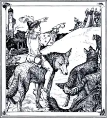Ferko commands the wolves to attack the court. Illustration for The Yellow Fairy Book (1894).