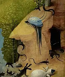 Comparisons have been made to Hieronymus Bosch's The Garden of Earthly Delights. The Great Masturbator is similar to an image on the right side of the left panel of The Garden of Earthly Delights composed of rocks, bushes and little animals resembling a face with a prominent nose and long eyelashes.[5]