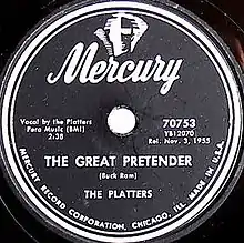 Buck Ram, the manager of The Platters said that he wrote the song in about 20 minutes in the washroom of the Flamingo Hotel in order to have a follow-up to the success of "Only You (And You Alone)". Ram had boasted to Bob Shad that he had an even better song than "Only You", and when pressed by Shad on the name of the song, Ram quickly replied "The Great Pretender".[3] He said the song would be a hit even before he had written the song to go with the title.[4] The song was recorded by The Platters and released in November 1955.[3] Plas Johnson played tenor saxophone on the recording. It became the best-selling R&B song in January 1956,[5] and reached No. 2 on the Top 100 chart on Billboard in February 1956.[6] It was also the 12th best-selling singles of 1956.[7]