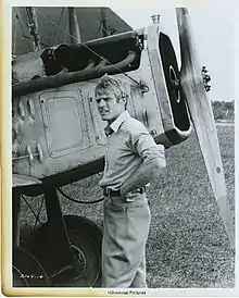 Redford in The Great Waldo Pepper, standing by the nose of a Standard J-1 biplane used in the movie.