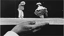 The Hand of the Artist is a 1906 British short silent animated comedy film, directed by Walter R. Booth, featuring the director's hand bringing to life photographic images of a young man and woman only for each sequence to end in them being crumpled up. The film features early use of stop action[1] to achieve its effect and had been described as the first British animated film.[2] It survives as part of the Corrick Collection of the Corrick family entertainers who toured Australia and the world between 1901 and 1914.[3][4]