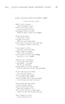 Mark Twain later recalled that Harte initially wrote the poem "for his own amusement", without intending to publish it. According to Twain, he "threw it aside, but being one day suddenly called upon for copy he sent that very piece in."[3] In writing the poem, Harte echoed and, therefore, lampooned Algernon Charles Swinburne's 1865 verse tragedy Atalanta in Calydon.[4] Ambrose Bierce claimed Harte originally sent it to him to include in his San Francisco-based News Letter, but he suggested it was better suited for Harte's own journal, the Overland Monthly.[5] It appeared there under its original title, "Plain Language from Truthful James" in the September 1870 issue. A Boston newspaper republished the work in 1871 as "The Heathen Chinee" and others have since used that name.[6]