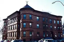 The Highland is set on the south side of Highland Avenue on Central Hill, directly opposite the city's high school. It is a three-story brick building, Richardsonian Romanesque in style, with brownstone trim, and a conical roof on its corner turret.[2] Brownstone beltcourses, varying in thickness, separate the basement, first, and second floors, and also separate the top of the third floor from the cornice, which has a band of dentil brickwork below the modillioned roof line. The main facade is six bays wide, divided into two similar sections having a rounded bay at the right. The main entrance is set in the third bay from the right beneath a large round brownstone arch.