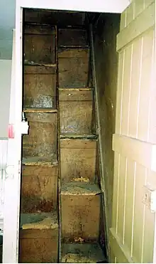 Internal features include a three-flight oak staircase with carved tread ends, a fully panelled dining room, a secret passage to the cellar, and an unusual split staircase leading to the roof. The plasterwork inside is impressive, and similar to other work in Derby by Abraham Denstone the elder.[4] The house also retains much of its original furniture.[2]