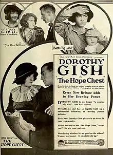 The Hope Chest is an American silent comedy-drama film released in 1918, starring Dorothy Gish. The film was directed by Elmer Clifton and based on a serialized story (and later novel) by Mark Lee Luther, originally published in Woman's Home Companion. It is not known whether the film currently survives.[1]