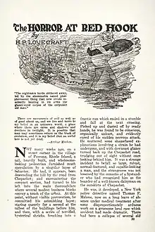 "The Horror at Red Hook" is a short story by American writer H. P. Lovecraft, written on August 1–2, 1925.[2] "Red Hook" is a transitional tale, situated between the author's earlier work and the later Cthulhu Mythos. Although the story depicts a sinister cult, this cult offers a conventionally occult devil-worshipping threat, rather than the cosmic threat depicted in his later work. Living in poverty in the slum of Red Hook at the time of writing, Lovecraft was at this time urgently attempting to widen his markets in the pulp magazines. By having an unusually proactive Irish New York police detective as his protagonist, he hoped for a swift sale to a detective pulp, which would have opened up a new market other than his usual Weird Tales magazine. He did not get such a sale, and had to fall back on Weird Tales. "Red Hook" was thus first published in the January 1927 issue of Weird Tales.[3]