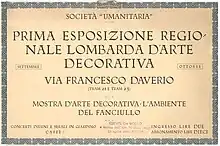 Poster of the first Lombardy regional exhibition of decorative art organized by the Humanitarian Society in 1919.