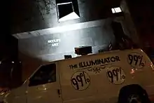 The Illuminator Art Collective was conceived of during the Occupy Wall Street movement in New York City in 2011. Given an initial monetary grant from Ben Cohen of Ben & Jerry's, the group purchased and retrofit a Ford cargo van to hold and maneuver a 12,000-lumen projector.[1] The collective typically uses the van to aid existing political movements and has worked with large political organizations such as Greenpeace but typically assists grassroots movements in and around New York City.[2] Their work has been covered by the U.S. East Coast and the British media.