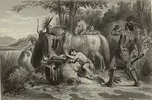 Additionally, there were approximately 40 plays with Indian themes recorded from 1825 to 1860 that likely were directly influenced by The Indian Princess.[14] Edward Henry Corbould's engraving (c. 1850), "Smith Rescued by Pocahontas" was possibly also directly inspired by The Indian Princess.[43] Disney's animated Pocahontas (1995) is one of the more recent of several films also in the same tradition as Barker's play.[25]