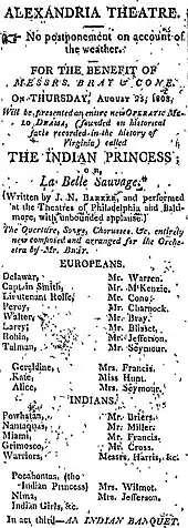 Barker's The Indian Princess has been cited as the first American play featuring Native American characters to ever be staged,[7][35] although Barker's play is predated by at least two offerings by Europeans featuring Native Americans, including Tammany in 1794 by British playwright Ann Kemble Hatton,[23] and German writer Johann Wilhelm Rose's Pocahontas: Schauspiel mit Gesang, in fünf Akten (A Play with Songs, in five Acts) in 1784.[36] At least one American play was also written before Barker's: Ponteach, published by Robert Rogers in 1766, though the piece was apparently never produced.[7] However, more recently uncovered evidence shows a record of an anonymous melodrama entitled Captain Smith and the Princess Pocahontas produced at The Chestnut Street Theatre in 1806, calling into question whether Barker's play was really the first of its kind (though no further information is known about the earlier piece).[37] Barker's play has also been cited as the earliest surviving dramatized account of Smith and Pocahontas,[2] although this idea is debunked by the availability of the aforementioned Johann Wilhelm Rose work.[38]