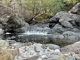 The Inkwells (also known as The Ink Wells) are two deep natural swimming pools in Lagunitas Creek, in Marin County, California.[2] The upper Inkwell is also known as "Shafters", named after the former railroad bridge that bore its name nearby, whereas the lower Inkwell is simply known as "Inkwell" or "Hole" because it is deeper and darker. Together, they are known as "The Inkwells". They are a common swimming spot in summer, despite failing to meet current water quality standards due to high levels of coliform.[3][4] The Inkwells are accessible by car as well as public transit, with a Marin Transit bus stop being less than a mile away.[5] The Inkwells Bridge, which runs above the inkwells, is part of the Bay Area Ridge Trail. It also carries pipes that bring water from nearby Kent Lake and the nearby Nicasio Reservoir to be treated.[6]