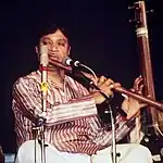The musicians at the sessions were recruited by Shambhu Das, who had assisted in Harrison's sitar tuition on his previous visit to Bombay, in 1966,[52] and Vijay Dubey, the head of A&R for HMV Records in India.[53] According to Lavezzoli and Beatles biographer Kenneth Womack, the line-up on the track was Aashish Khan (sarod), Mahapurush Misra (pakhavaj), Hanuman Jadev (shehnai), Hariprasad Chaurasia (bansuri) and Rijram Desad (harmonium).[12][54] In Lavezzoli's view, although these instruments are more commonly associated with the Hindustani discipline, the performers play them in a South Indian style, which adds to the Carnatic identity of the song.[12] He highlights the manner in which the sarod, traditionally a lead instrument in North India, is played by Khan: staccato-style in the upper register, creating a sound more typical of acoustic guitar. Similarly, the pakhavaj is performed in the style of a South Indian tavil barrel drum, and the sound of the double-reed shehnai is closer to that of its Southern equivalent, the nagaswaram.[12] The recording includes tabla tarang[43] over the quiet, vocal interludes.[55]