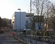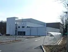 Falmer railway station is nearby, and new bus stops have been built on both sides of the A270.[10] Public footpaths and a cycle path will be built through the site to connect it with the Moulsecoomb estate and the adjacent road; this was estimated to cost £33,000.[16][17] A 69-space car park and 20-space bicycle park have been provided behind the building. Coach parking facilities have been added on the south side.[18][19]