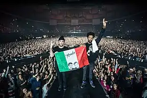 The Knocks have shared the stage with artists such as The 1975, Justin Bieber [Purpose Tour[33]], Bruno Mars, Chromeo, Deadmau5, Skrillex, Jay-Z, Big Boi, M.I.A., Sleigh Bells, Tiesto, Martin Solveig, Weezer, Die Antwoord, Edward Sharpe and the Magnetic Zeros, Two Door Cinema Club, and Calvin Harris.[34][35][36][37][38]