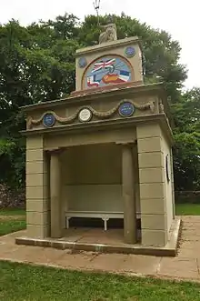 The Naval Temple was constructed by the Kymin Club in 1800 to commemorate the second anniversary of the British naval victory at the Battle of the Nile in 1798 and in recognition of sixteen of the British Royal Navy's Admirals who had delivered significant victories in other major sea battles of the age around the globe to that date.[2] The temple was dedicated by the Duchess of Beaufort, the daughter of Admiral Boscawen, one of those commemorated in the building.[7] Nelson visited Monmouth in 1802, along with Lady Hamilton and her husband, Sir William Hamilton.[8] They travelled on the River Wye from Ross-on-Wye to Monmouth, to be greeted by a cannonade and the band of the Monmouthshire Militia playing See, the Conquering Hero Comes.[8] Staying in Monmouth for just a couple of days, Nelson visited the Naval Temple and the Roundhouse on Kymin Hill, where he breakfasted and admired the views. He was struck with the Naval Temple, saying that "it was the only monument of its kind erected to the Royal Navy in the Kingdom".[8]