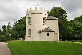 The Roundhouse was built by members of the Monmouth Picnic Club or Kymin Club, a group of Monmouth's gentlemen, led by Philip Meakins Hardwick.[2] The members of the Kymin Club were drawn from "the principal Gentlemen of Monmouth and its vicinity", and met each week "for the purpose of dining together, and spending the day in a social and friendly manner".[1] The Roundhouse was constructed to provide "security from the inclemency of the weather"[1] and the subscription list for funding was headed by the local landowner, the Duke of Beaufort, and eight Members of Parliament. Construction began in 1794,[2] and the local author and artist Fred Hando records that the building "was completed within two years".[3] The building was sited to take advantage of the views and the Monmouth antiquarian and publisher Charles Heath recorded in his 1807 history; Descriptive Account of the Kymin Pavilion and Beaulieu Grove with their various views; also a description of the Naval Temple that ten counties could be seen from the Roundhouse; (Gloucestershire, Monmouthshire, Glamorganshire, Breconshire, Montgomeryshire, Worcestershire, Herefordshire, Radnorshire, Shropshire and Somerset).[1] A telescope by Peter Dollond was fitted in the upper room and Heath detailed a large number of the sights that could be viewed from the five windows.[4]