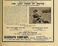 The Last Drop of Water is a 1911 American short silent Western film directed by D. W. Griffith and starring Blanche Sweet. Three known prints of the film survive.[1] It was filmed in the San Fernando desert as well as Lookout Mountain, California. The film was considered the "most ambitious film made by Griffith during the California trip of 1911" before the Biograph company moved back to New York. It was filmed on or between the 14 May and May 20, 1911. It was reissued by Biograph August 13, 1915.