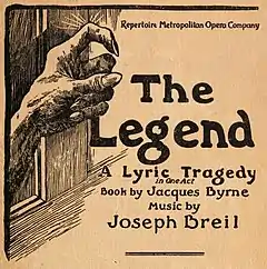 The Legend is a one-act tragic opera composed by Joseph Carl Breil to an English libretto by Jacques Byrne. It premiered at the Metropolitan Opera in New York City on March 12, 1919 in a triple bill with two other one-act operas, John Hugo's The Temple Dancer and Charles Cadman's Shanewis. Its melodramatic story is set in Muscovadia, a mythical country in the Balkans, and involves an impoverished nobleman turned bandit, his daughter Carmelita, and her lover Stephen, a captain in the hussars. The action unfolds over a single night at the end of which both lovers are dead—Stephen stabbed to death by Carmelita and Carmelita shot by Stephen's fellow hussars. The only one of Breil's six operas to be performed by a major opera company, The Legend received scathing press reviews and after its three performances at the Met disappeared from the repertory.