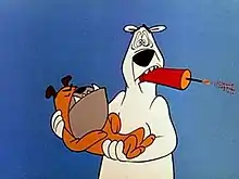 Chilly's next attempt to wake the dog up involves placing several lit firecrackers around him. Charlie manages to plug the dog's ears just before the firecrackers burst, then sings him to sleep again. Chilly then ties the sleeping dog to Charlie's ankle with rope, then sticks a lit firecracker into the dog's mouth. As Charlie suddenly realizes this, he drops the fish, unties the rope around his ankle, holds the firecracker in his own mouth, and picks up the fish before running off again. As Charlie puts down the fish and opens the door to exit, Chilly swaps out the fish for the sleeping dog. Upon rushing outside into the snow Charlie suddenly realizes he is holding the dog, and the firecracker explodes, waking up the dog, who bites Charlie in the rear again. Charlie then sings the dog to sleep again.