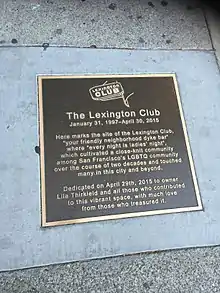 - 1 2 Quinlan, Julia (September 20, 2016). "Plaque Unveiled To Commemorate The Lexington Club". hoodline. Retrieved March 25, 2017.
