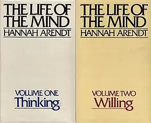 The Life of the Mind was the final work of Hannah Arendt (1906–1975), and was unfinished at the time of her death. Designed to be in three parts, only the first two had been completed and the first page of the third part was in her typewriter the evening of the day she suddenly died. The unfinished work was edited by her friend, author Mary McCarthy, and published in two volumes in 1977 and 1978.