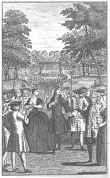 The London Merchant originally closed with a gallows scene that Lillo was encouraged by his associates to cut from the production of the play. The scene was a reflection of the high number of public executions taking place at the time. During the eighteenth century, six times a year, the government would execute a large number of people at Tyburn for the crime of theft. This practice was especially prevalent during the 1720s. These hangings disproportionately featured people belonging to the poor, lower class, many of whom were former apprentices. There were a number of scuffles during these executions between government representatives and the public as they tried to prevent both the hangings as well as the removal of the bodies.[17] There are a number of theories regarding the removal of this scene. Among them are the fact that the bourgeoisie did not wish to expose the brutality that was primarily the result of a class pushed to thievery because of the treatment they received from the upper class. It was also a very literal interpretation of the harsh discipline of the day which many of these apprentices had witnessed firsthand. Another theory is simply that the scene would have been too "entertaining" for the ideas that it attempted to portray to come across properly.[16] Although published with some versions of the play, this scene was not staged in a production of The London Merchant until the Theatre Royal Bury St Edmunds's 2010 production in-the-round.[18]