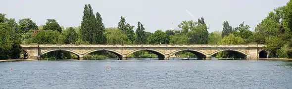 In 1730 Queen Caroline, wife of George II, ordered the damming of the River Westbourne in Hyde Park as part of a general redevelopment of Hyde Park and Kensington Gardens. Original monastic ponds may have existed in the location; these were modified as part of the 1730–1732 scheme to create a single lake.[3] At that time, the Westbourne formed eleven natural ponds in the park. During the 1730s, the lake filled to its current size and shape. The redevelopment was carried out by Royal Gardener Charles Bridgeman, who dammed the Westbourne to create the artificial lake, and dug a large pond in the centre of Kensington Gardens (The Round Pond) to be a focal point for pathways in the park.[4]