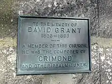 The putative composers both have memorials; a memorial plaque at St Clement's East Church in Aberdeen commemorates David Grant, a former parishioner there, as the composer,[16] while inside Crimond Parish Church, a set of four etched glass panels installed in 2002 commemorate Jessie Seymour Irvine as the composer.[8][17]