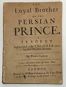 The Loyal Brother; Or, The Persian Prince is a 1682 tragedy by the Irish writer Thomas Southerne. It was first performed by the King's Company at the Theatre Royal, Drury Lane in London. The prologue was written by John Dryden. It was Southerne's first play and was written in the context of the recent Exclusion Crisis and the Popish Plot from a Tory viewpoint. Two characters are thinly disguised versions of contemporary figures, the heroic Tachmas is James, Duke of York and the villain is the Whig politician the Earl of Shaftesbury.[1] It was staged at a time when the growing Tory Reaction had swung power away from the Whigs trying to exclude the Catholic York from the throne.