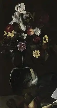The flowerpiece is of major importance for the still-life tradition, not only in Italy, but also in the Netherlands, and there is a certain link to earlier Flemish painting; for example, many of the Flemish flower painters, from Jan Brueghel to Ambrosius Bosschaert and Van der Ast, often waited to study separate specimens in various seasons of the year but include them all in a fictive assembly. The fruits in the Luteplayer, however, are not of the same season as the flowers, suggesting a similar cross-seasonal approach as Brueghel and Bosschaert.