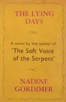 The Lying Days is the debut novel of Nobel winning South African novelist, Nadine Gordimer. It was published in 1953 in London by Victor Gollancz and New York by Simon & Schuster. It is Gordimer's third published book, following two collections of short stories, Face to Face (1949), and The Soft Voice of the Serpent (1952).[1][2][3] The novel is semi-autobiographical, with the main character coming from a small mining town in Africa similar to Gordimer's own childhood.[4] The novel is also a bildungsroman "about waking up from the naivete of a small colonial town."[5]