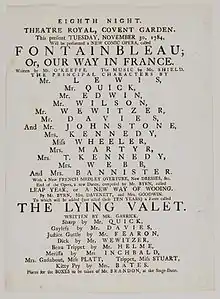 The Lying Valet is a British play by David Garrick. A farce, it was first performed at the Goodman's Fields Theatre on 30 November 1741. Garrick based his work on the second act of All Without Money by Peter Antony Motteux, which was in turn inspired by a French play. Garrick initially followed the plots of the earlier plays quite closely, but the work soon diverges significantly. It was the only one of Garrick's plays which was completely sentimental in nature.[1]