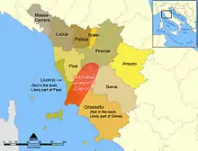 - ↑ Fictional Caprona is on the coast not far from the Italian Riviera, presumably south of Pisa because it borders on Pisa, Florence, and Siena exclusively and in a world that is parallel and close to ours.