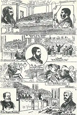 In January 1880, the festival committee, after considering other conductors, asked Sullivan to conduct the Leeds festival, which was to run from 13 to 16 October. This was a popular choice, as one columnist wrote, "for an English Festival we are to have an English conductor. Too long have we in this country bowed down to foreign talent, even when it has been far inferior to English talent."[11] When Sullivan stood before the festival chorus of 306 voices for his first rehearsal in Leeds on 4 June 1880, they greeted him with cheers and applause. On 31 August he first rehearsed The Martyr of Antioch at Leeds. He outlined the narrative of the new work to the chorus before proceeding with the rehearsal, which was reported in a local newspaper: