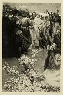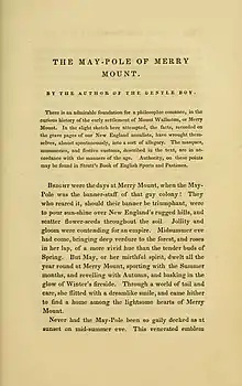 "The May-Pole of Merry Mount" is a short story by Nathaniel Hawthorne.[1] It first appeared in The Token and Atlantic Souvenir in 1836. It was later included in Twice-Told Tales, a collection of Hawthorne's short stories, in 1837.[2] It tells the story of the colony of Merry Mount (aka Mount Wollaston), a 17th-century British colony located in what is now Quincy, Massachusetts.
