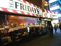 The building includes a Ruth's Chris Steakhouse on West 51st Street, and once contained America's largest T.G.I. Friday's restaurant,[17] located in the space that once housed the lobby of the Roxy Theatre. The T.G.I. Friday's closed due to the effects of the COVID-19 pandemic.[18]