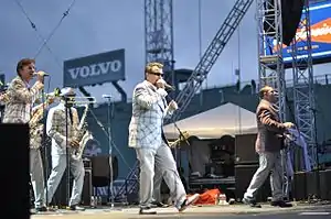 The Mighty Mighty Bosstones (informally referred to as The Bosstones and often stylized as The Mighty Mighty BossToneS) were an American ska punk band from Boston, Massachusetts, formed in 1983.[1][2][3] From the band's inception, lead vocalist Dicky Barrett, bassist Joe Gittleman, tenor saxophonist Tim "Johnny Vegas" Burton and dancer ("Bosstone") Ben Carr remained constant members. The band's final line-up also included drummer Joe Sirois, saxophonist Leon Silva, guitarist Lawrence Katz, keyboardist John Goetchius, and trombonist Chris Rhodes.